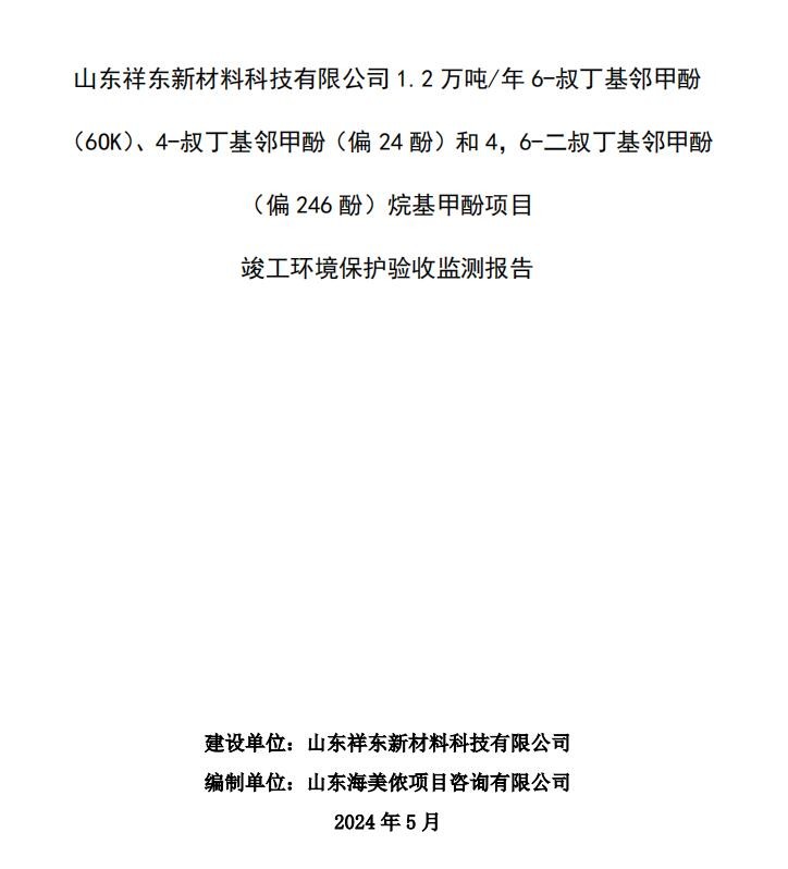 山東祥東新材料科技有限公司1.2萬噸/年6-叔丁基鄰甲(60K)、4-叔丁基鄰甲酚(偏 24 酚)和 4,6-二叔丁基鄰甲酚(偏 246 酚)烷基甲酚項目竣工環境保護驗收監測報告