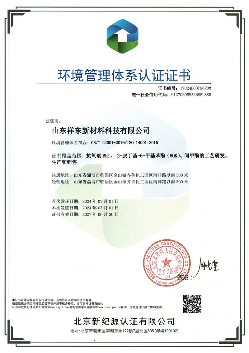 山東祥東新材料科技有限公司1.2萬噸/年6-叔丁基鄰甲(60K)、4-叔丁基鄰甲酚(偏 24 酚)和 4,6-二叔丁基鄰甲酚(偏 246 酚)烷基甲酚項(xiàng)目竣工環(huán)境保護(hù)驗(yàn)收監(jiān)測報(bào)告